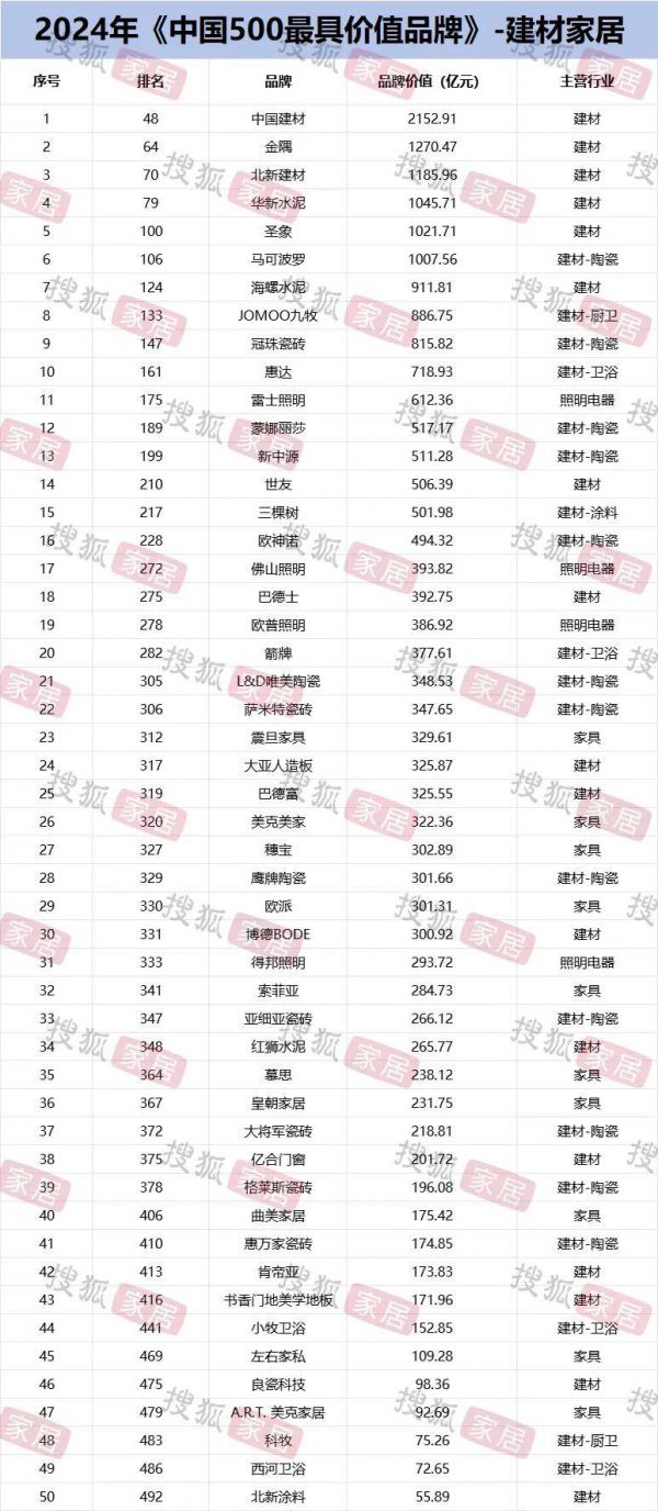 6月19日,2024年(第21届)“世界品牌大会暨中国500最具价值品牌发布会”在北京举行,发布2024年《中国500最具价值品牌》榜单。据不完全统计,包括北新建材、圣象、马可波罗瓷砖、JOMOO九牧、冠珠瓷砖、惠达、蒙娜丽莎、三棵树、亿合门窗等在内,共50家建材家居品牌入榜,覆盖陶卫、照明、涂料、家具、门窗等多个领域。