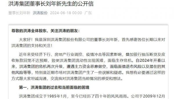 6月18日,深圳洪涛集团股份有限公司董事长刘年新通过“洪涛股份”微信公众号发布公开信,提及洪涛集团当前面临的困境,以及个人通过质押股票和房产设法帮助洪涛走出困境。公开信显示,近年来受经济下行、房地产行业调控、疫情冲击等因素影响,叠加银行抽压断贷及应收账款回笼不达预期,致使洪涛集团流动性出现困难,面临生存危机。