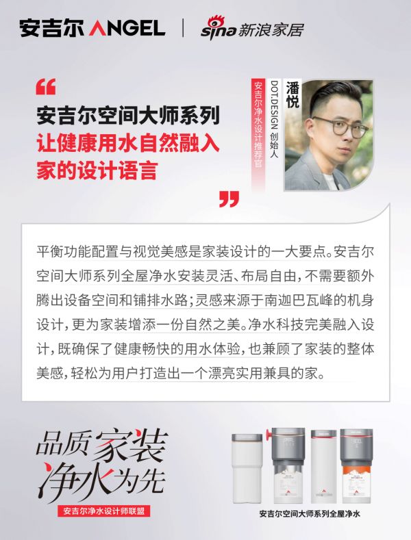首先,安吉尔以“净水设计师联盟”集结全国优秀设计师,共同推动“净水前装”理念走入家装主流语境。从净水空间共创、案例实景落地,到行业专家证言,安吉尔与设计师群体形成了深度共创机制,让净水产品真正融入一个个可被感知的生活场景。设计师不再只是推荐者,更是理念的共创者,安吉尔也因此赢得了专业圈层的高度信任与持续推荐。