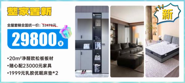 同时,太子家居推出“整家置新”尊享套餐,全国统一价53478元,现活动价29800元,套餐包含:20㎡净醛欧松板材全屋定制+23000元家具随心配+价值1999元乳胶优眠床垫两张。一次购齐品质家居,实现全屋风格统一。