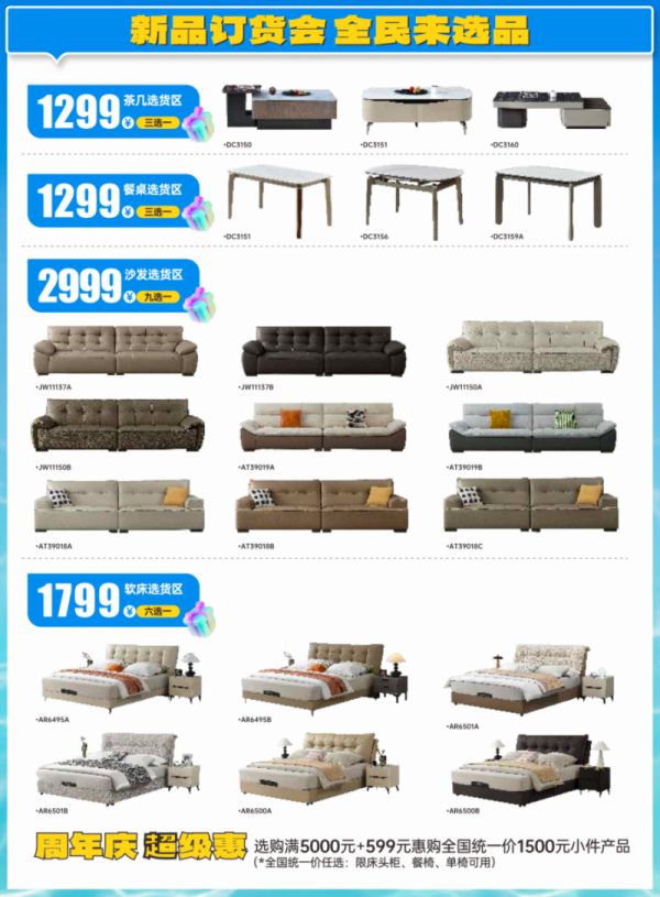 周年庆,超级惠。以上商品选购满5000元,即可599元惠购全国统一价1500元小件产品(床头柜、餐桌、单椅任选其一)。