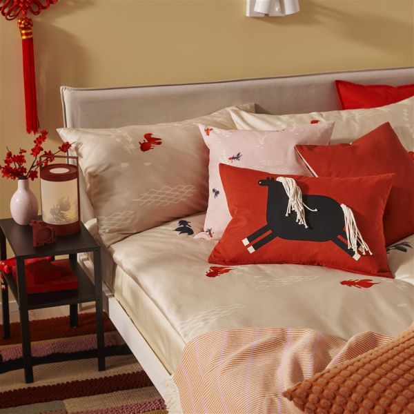 这一系列的设计从真实生活出发,致力于打造长期主义的体验,不论在节日假期还是在更长久的日常生活里,都能个性化使用这些产品:生肖马元素集中用于节日装饰如靠垫套、门垫、窗饰,强化春节仪式感;金鱼元素则贯穿全年,应用于餐具、床品与LED提灯,让美好祝愿融入日常。