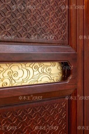 作为红木整装引领品牌的卓木王,以大漆剔红为背景墙,营造出一种既庄重又不失华丽的氛围。两侧矗立独板缅甸花梨木雕屏风,深浮雕“锦鸡牡丹”与“松鹤藤萝”,底饰七枚铜钱纹,寓意富贵盈门。