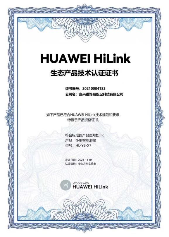 2021年,怀里智能浴宝HL-YB-X7成功通过华为HiLink的技术规范检验,荣获华为HiLink生态产品技术认证证书,意味着该产品可以与华为智能生态产品互联互通,给用户带来更加智能、安全、快捷的体验。