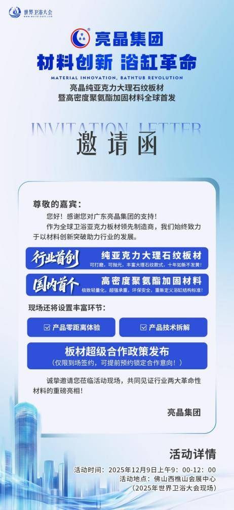 2025年12月9日,佛山・西樵山会展中心(2025世界卫浴大会主场馆),亮晶“材料创新浴缸革命——纯亚克力大理石纹板材与高密度聚氨酯加固材料全球首发”发布会,期待与您携手,共启卫浴材料行业全新未来!
