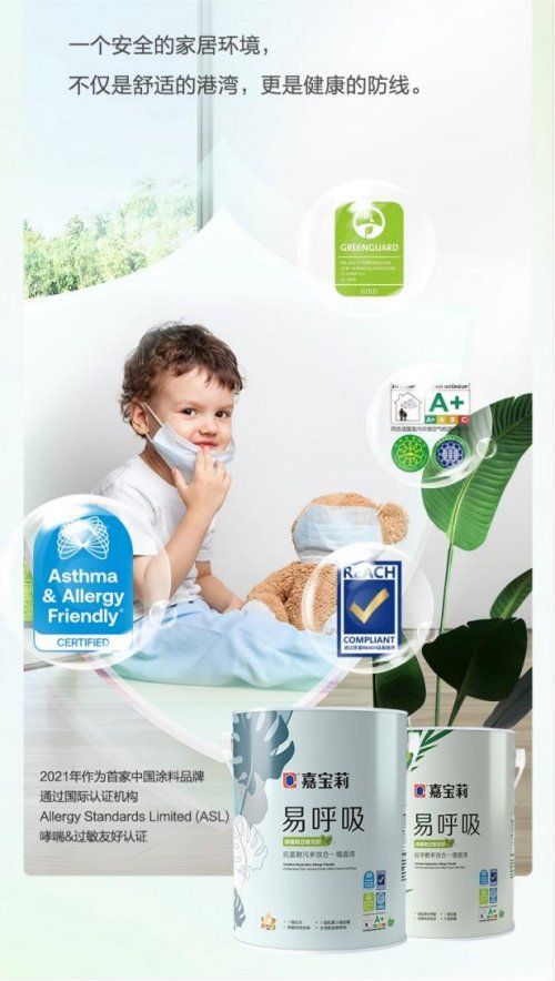 易呼吸产品是中国涂料品牌首款通过国际认证机构过敏标准有限公司Allergy Standards Limited(ASL)发起的哮喘&过敏友好®认证的高品质环保产品,严选抗过敏配方,并通过了FDA食品接触级标准、欧盟REACH法规、美国UL GREENNGUARD室内空气质量金级标准认证,法国室内环境空气检测A+级标准、中国双十环标准等六重国内外权威检测符合环保高标准,更适合易过敏、哮喘人群。