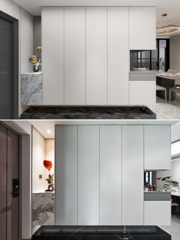 定制悬浮式鞋柜,视觉通透。免拉手平面门板,简约耐看。大理石地台提升空间格调,搭配栅格与灯带,灵动且有质感。