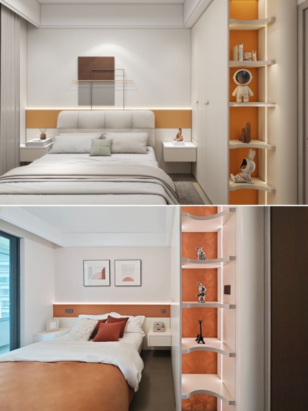 衣柜侧边定制开放式陈列柜,圆弧柜与圆弧层板柔化空间棱角。活力亮橙艺术背板做撞色设计,与床头护墙板相呼应,元气值拉满。