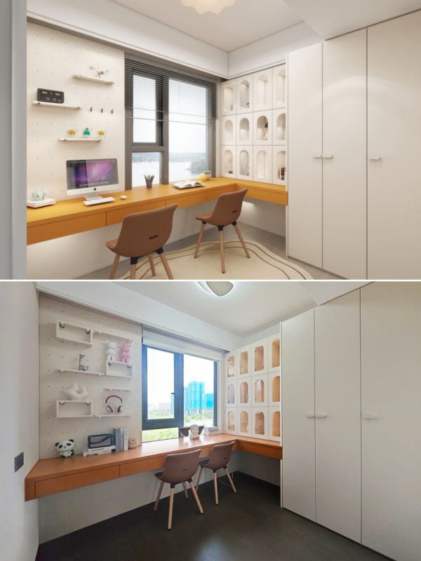 衣柜、书柜与L型书桌一体化设计,轻松打造双人办公区。靠窗布局采光通透明亮,搭配大容量储物空间,整洁又清爽。